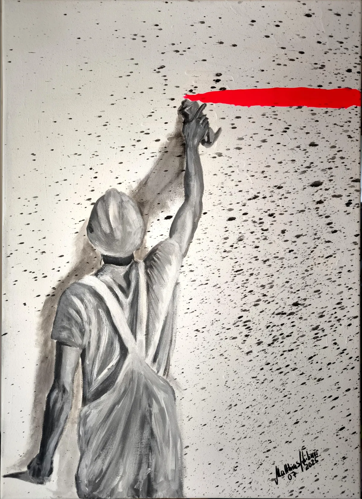 Monochrome, jugendliche Figur im Profil mit nach hinten geneigtem Kopf und offenen Armen; magentafarbene Striche über Stirn, helle Sprenkel links, schwarzer Grund rechts – ‚Farbstrich Ende‘ (2025).