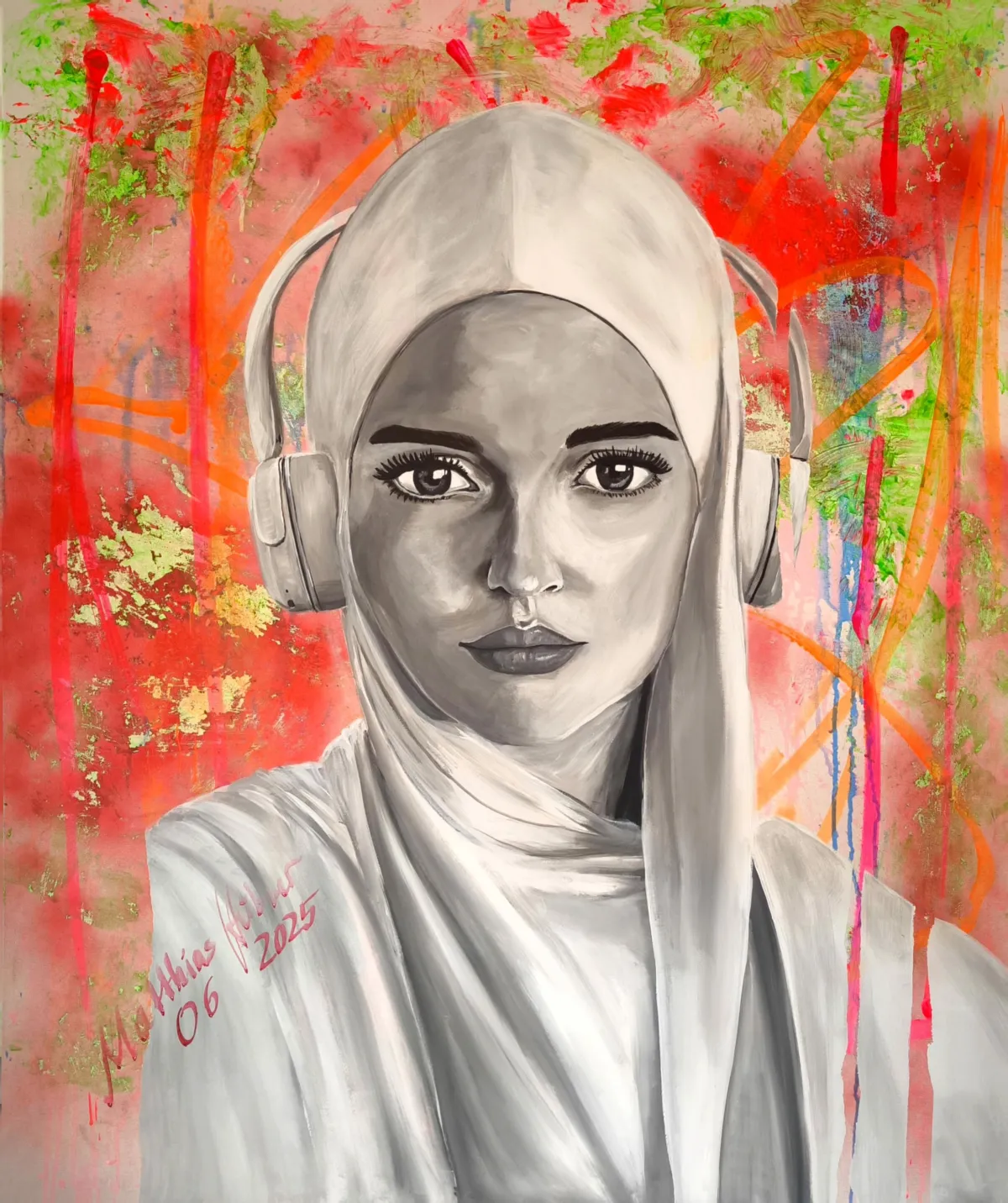 Schwarz-Weiß-Porträt einer jungen Frau mit Kopftuch und Kopfhörern vor leuchtend rot-grünem, abstrakt-gestischem Farbfeld – ‚Generation‘ von Matthias Hübner (2025)