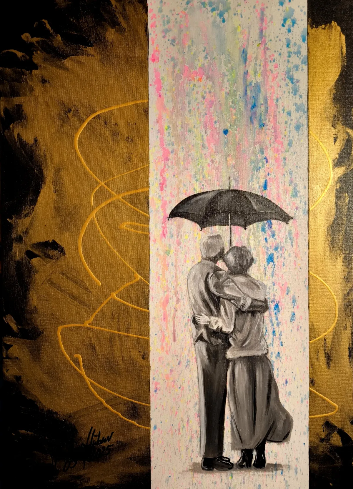 Monochromes Paar unter schwarzem Regenschirm in schmaler Weißbahn; pastellfarbiger Regen, flankiert von schwarzem Goldgrund – ‚Goldregen‘ von Matthias Hübner (2025).