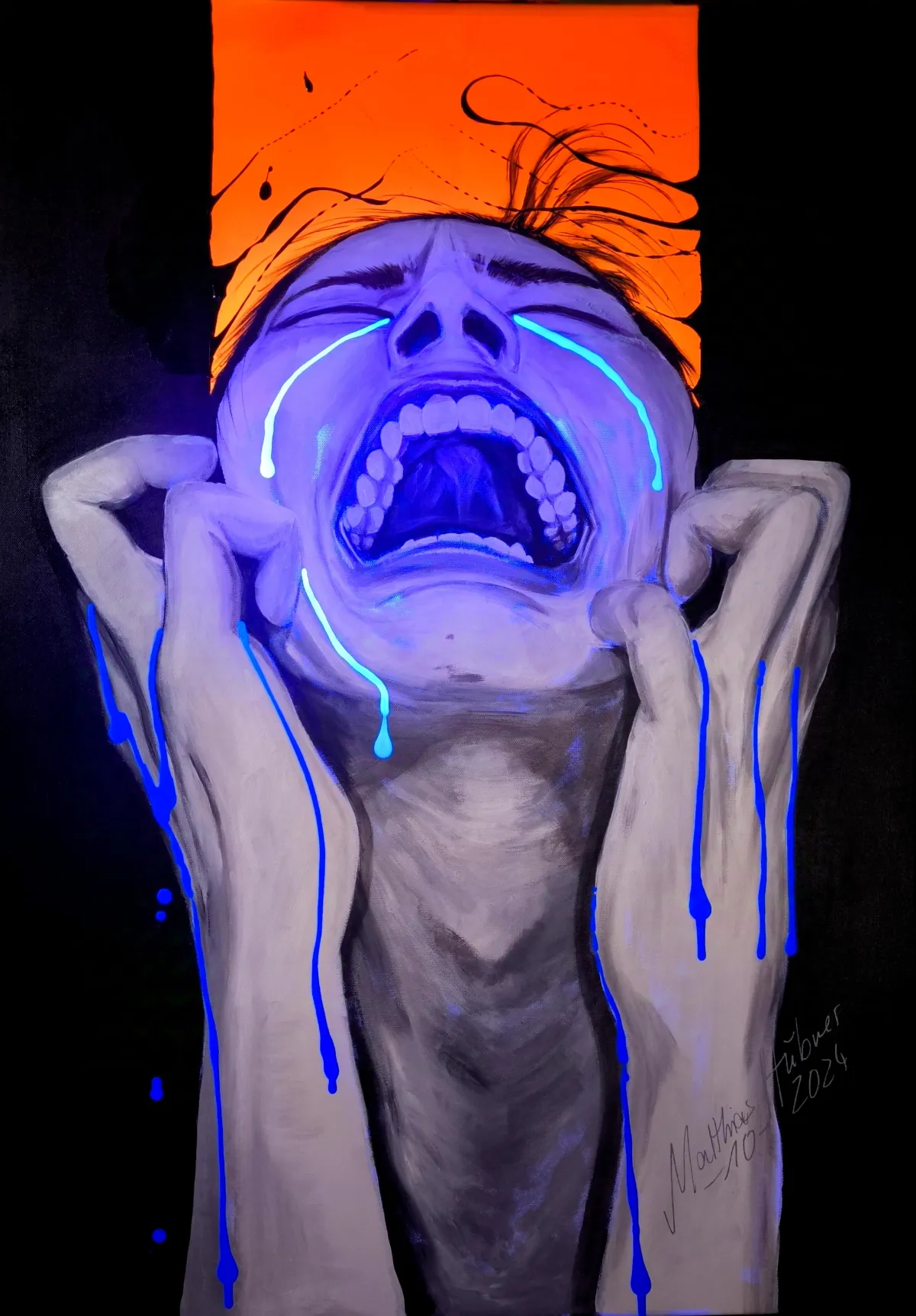 Monochromes Schrei-Porträt mit oranger Stirnfläche und leuchtend blauen Tränenlinien; Hände an den Wangen – ‚Wohin?‘ von Matthias Hübner (2024).