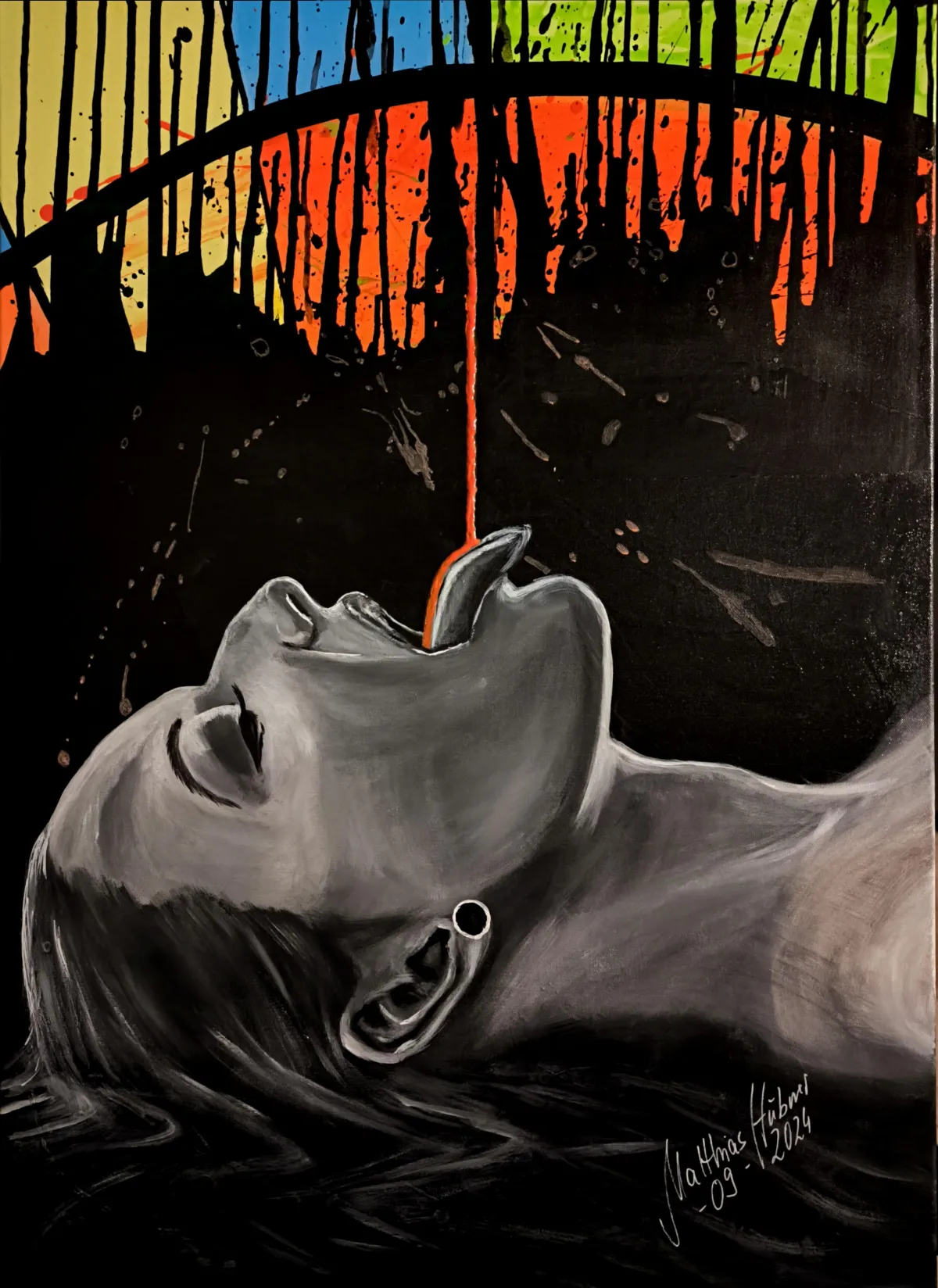 Monochrome, liegende Kopfstudie im Profil; ein oranger Farbstrahl tropft von oben auf die Zunge, darüber ein drippender Farbhorizont – ‚Energy‘ von Matthias Hübner (2024).