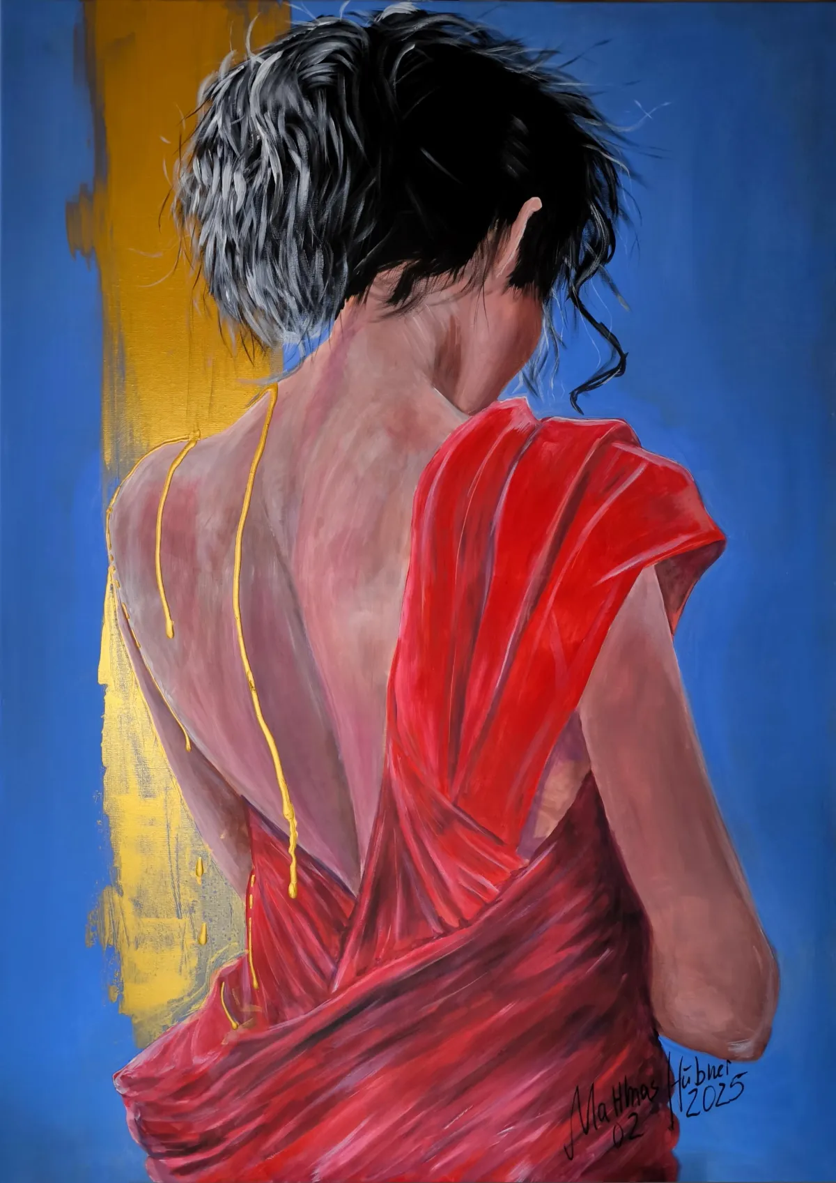 Rückenansicht einer Frau im roten Gewand vor intensiv blauem Grund; links ein vertikales Goldfeld mit gelben Farbläufen über der Schulter – ‚Göttin‘ von Matthias Hübner (2025).
