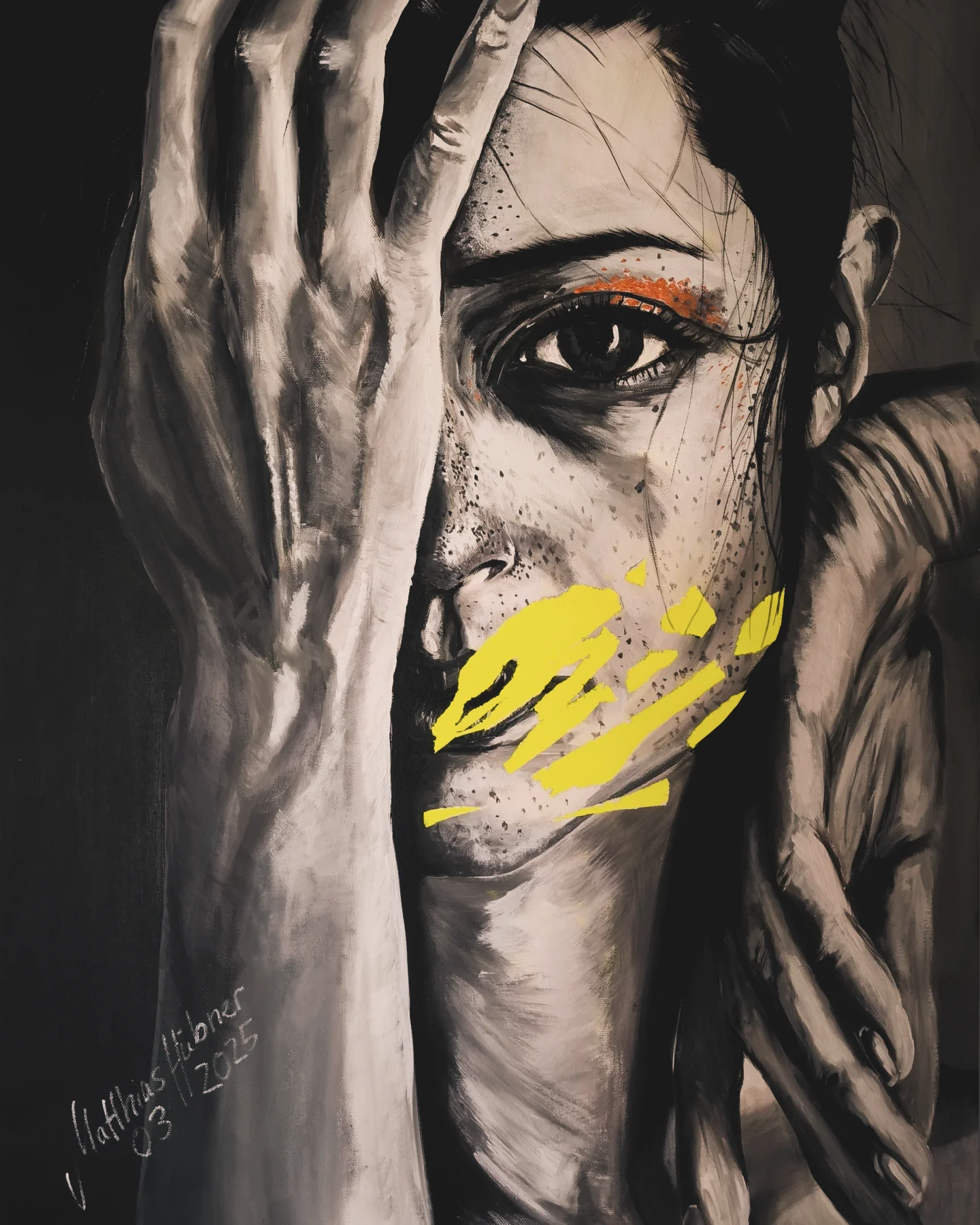 Monochromes Porträt mit halb verdecktem Gesicht; direktes Auge, orange Lidstrich, gelber Pinselzug über dem Mund – ‚Rosé‘ von Matthias Hübner (2025).