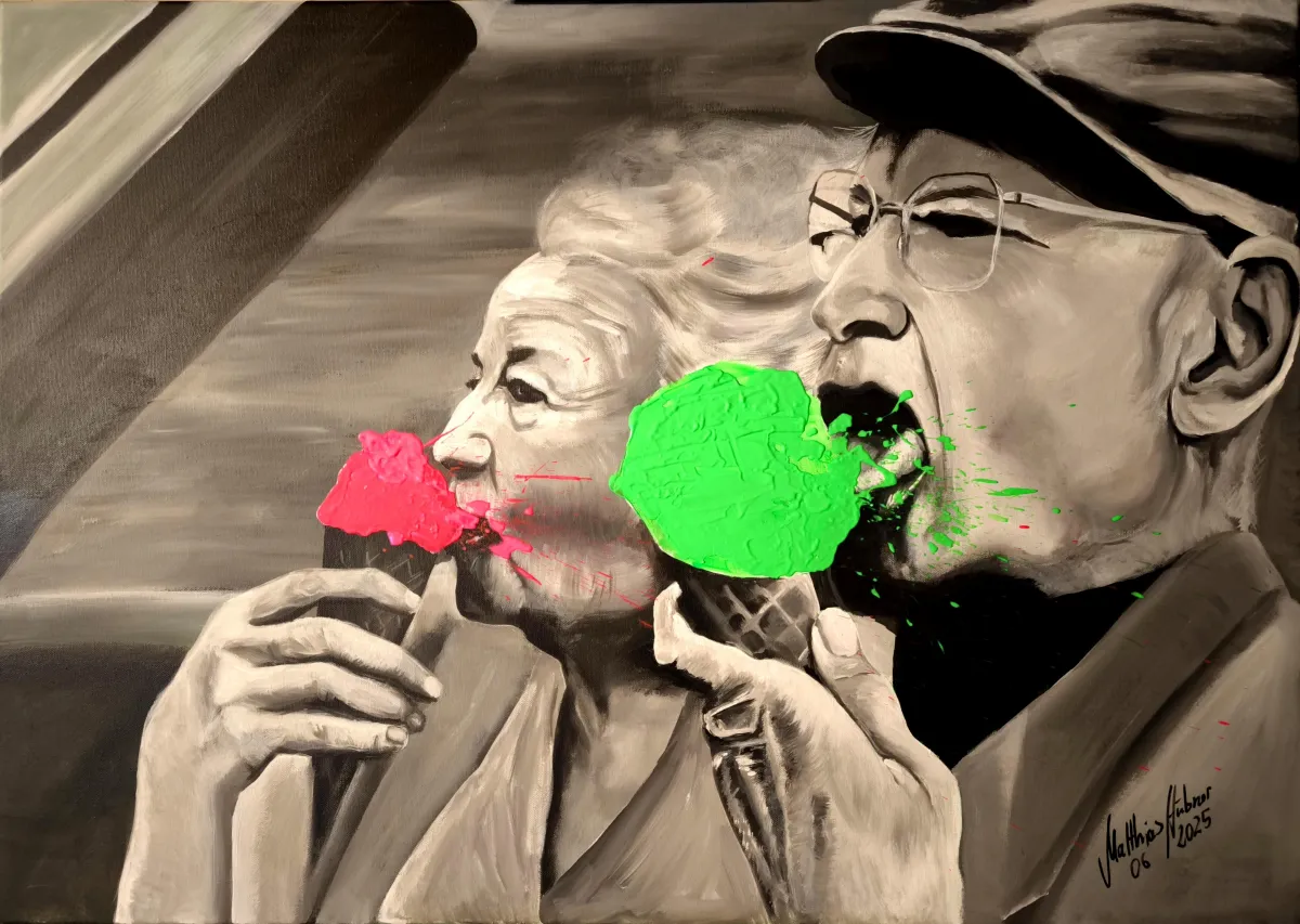 Schwarz-Weiß-Gemälde eines älteren Paars im Auto, das Eis isst; neonpinkes und neongrünes, pastos aufgetragenes Eis spritzt dynamisch – ‚Ausfahrt‘ von Matthias Hübner (2025).