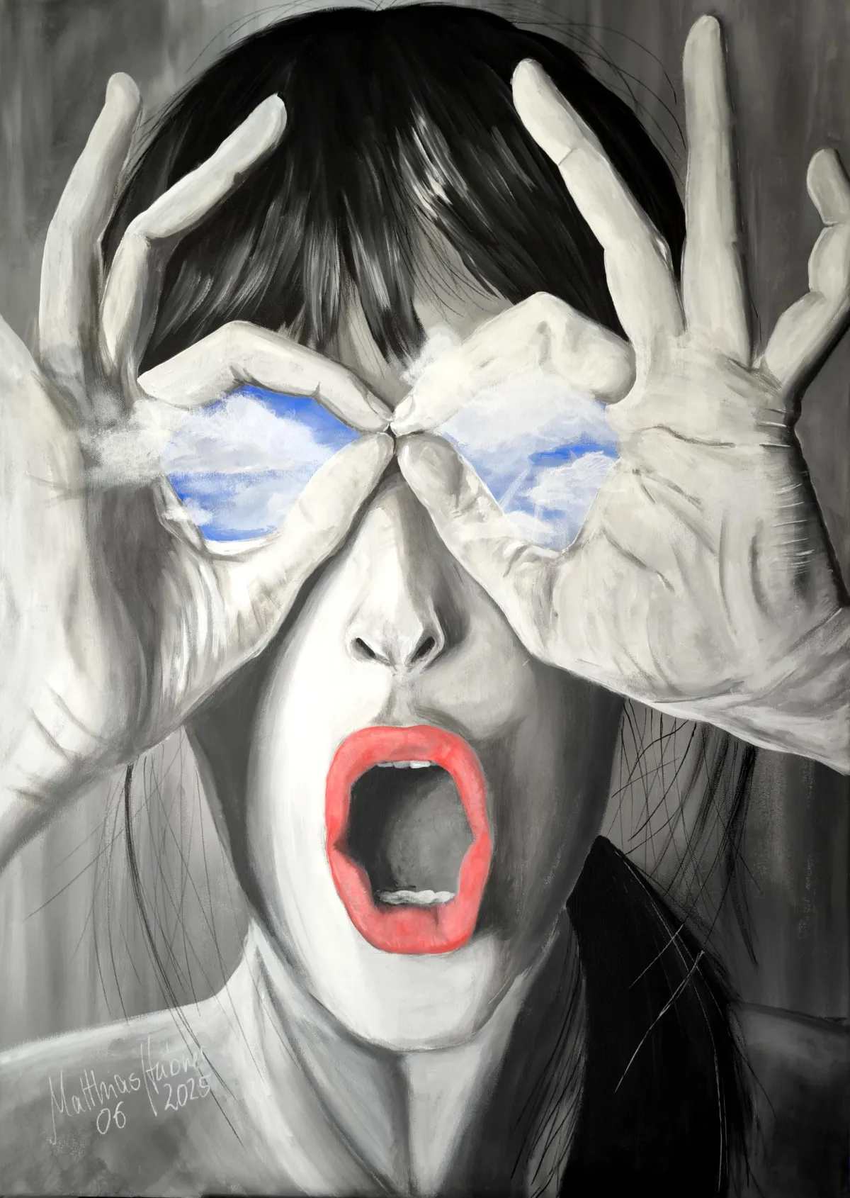 Monochromes Porträt mit Händen als Ferngläsern; in den ‚Gläsern‘ blauer Himmel mit Wolken, der Mund leuchtend rot – ‚Himmel‘ von Matthias Hübner (2025).