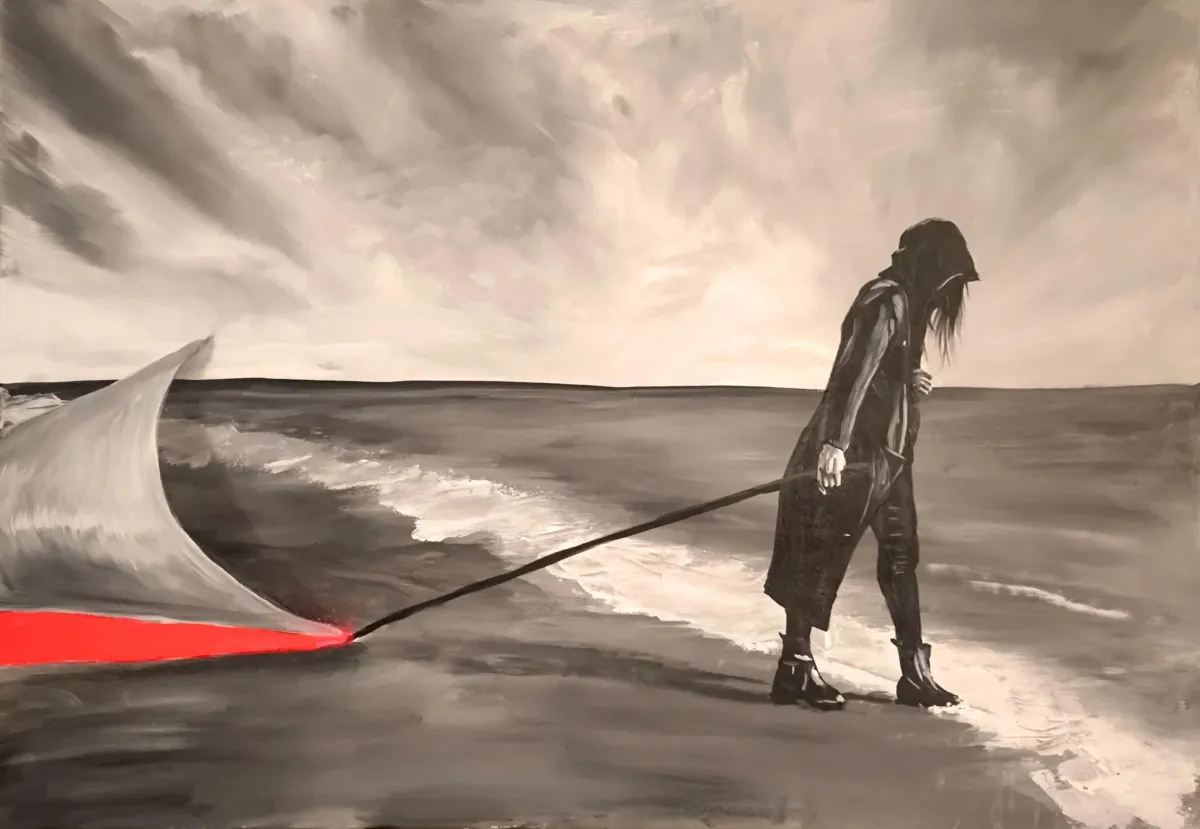 Monochrome Küstenszene: Figur im Mantel zieht an einer Leine eine flossenartige Form durchs Wasser; roter Leuchteffekt am Kontaktpunkt – ‚Flucht‘ von Matthias Hübner (2025).