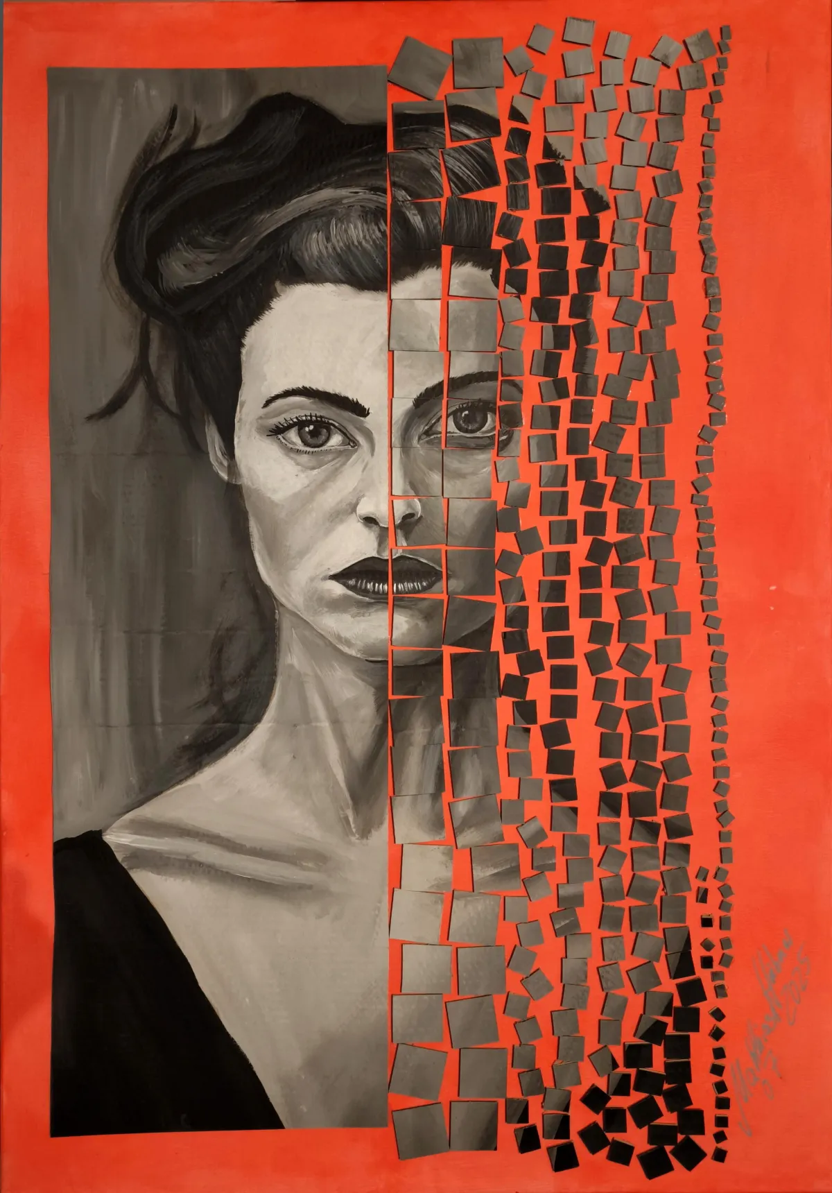Monochromes Frauenporträt, dessen rechte Gesichtshälfte in graue Quadrate zerfällt; intensiver roter Hintergrund – ‚Digital‘ von Matthias Hübner (2025).