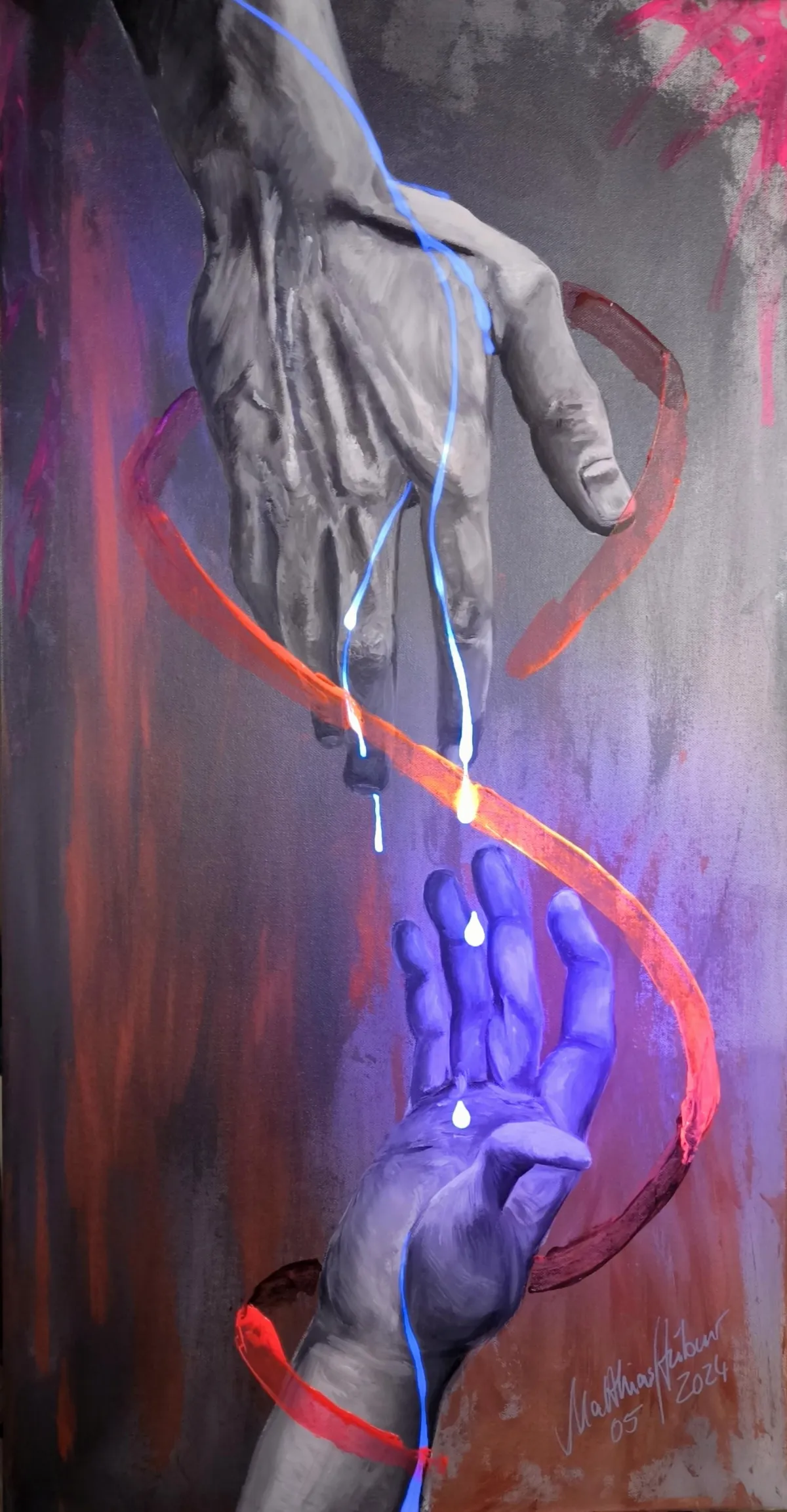 Zwei monochrome Hände im Hochformat: oben gebend, unten empfangend; neonblaue Linien und rotes Band umspielen die Gesten – ‚D.V.‘ von Matthias Hübner (2024).